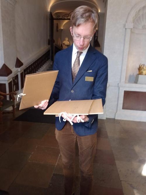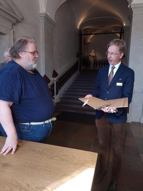Huusgavelin vaakuna löytyi kun Ingan kanssa tutkittiin ensin aulan kirjoista numerosarjat. Huggut ei ollut yläsalissa vaan oli mentävä salin keskellä sijaitsevat portaat alas ja heti sen sen oikeanpuoleisella seinällä. Saimme hienon vastaanton ja kiitokset teoksista. Päiväkin paistoi kauniisti Tukholmassa!